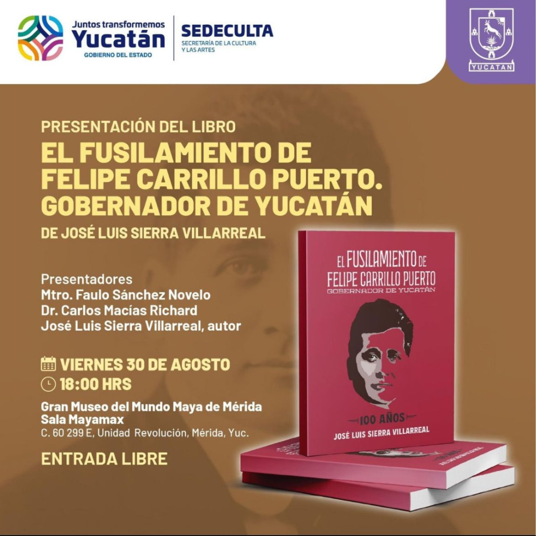 30 agosto, 2024 Presentación del libro “El Fusilamiento de Felipe Carrillo Puerto. Gobernador de Yucatán” Leer más